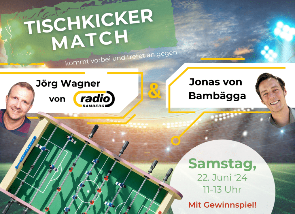 Am kommenden Samstag wird im ERTL-Zentrum live gekickert. Von 11 bis 13 Uhr kann jeder – alleine oder als 2-er-Team antreten gegen die zwei Promi-Fan-Profis Jörg und Jonas Ochs. Beide sind vollkommen fußballbegeistert, spielen selbst oder treten sogar als Schiedsrichter in Erscheinung. Den meisten Fans sind sie wahrscheinlich aber als Moderator bei Radio Bamberg bzw. Frontman der Rap-Combo „BAMBÄGGA“ bestens bekannt.