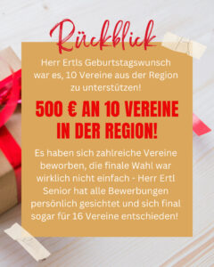 Zum 88. Geburtstag unseres Seniorchefs Karlheinz Ertl haben wir eine besondere Spendenaktion ins Leben gerufen – als Zeichen der Wertschätzung für all jene Menschen, die sich mit Herzblut für das Gemeinwohl engagieren.