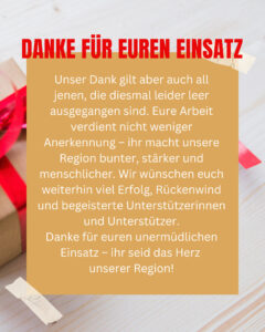 Ein großes Dankeschön geht auch an all jene, die diesmal leider nicht berücksichtigt werden konnten. Eure Arbeit ist ebenso wichtig und verdient unsere volle Anerkennung. Ihr macht unsere Region bunter, stärker und menschlicher.